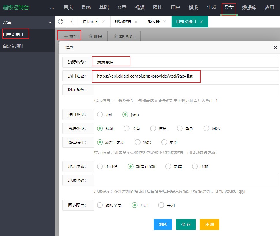 第二步:添加采集接口:https://api.ddapi.cc/api.php/provide/vod/?ac=list
